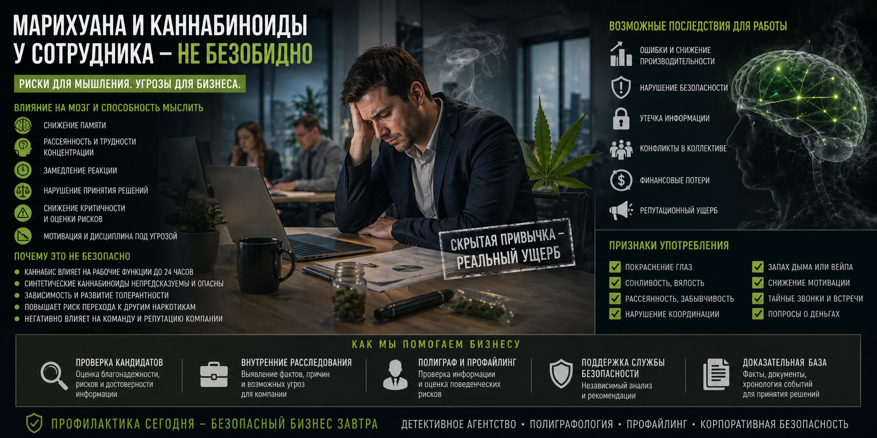 С позиции руководителя детективного агентства, криминального психолога, полиграфолога и профайлера важно смотреть на вопрос не через бытовые мифы, а через риски. Для бизнеса имеет значение не только сам факт употребления, а то, как каннабиноиды влияют на мышление, память, внимание, мотивацию, дисциплину, способность принимать решения и соблюдать правила.